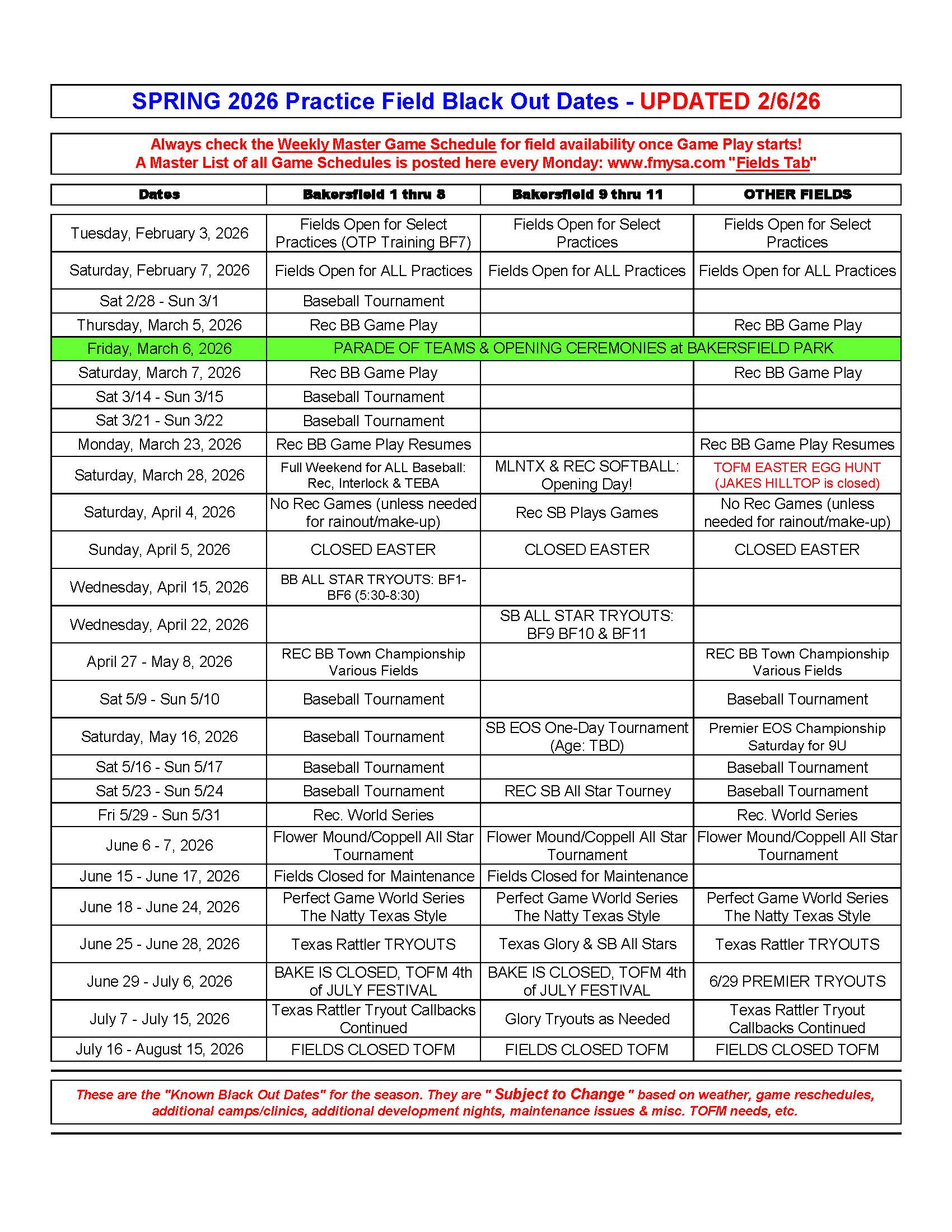 Always check the Weekly Master Game Schedule for field availability once game play starts!